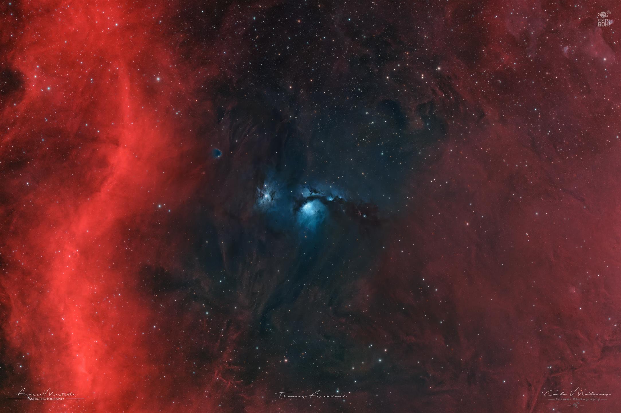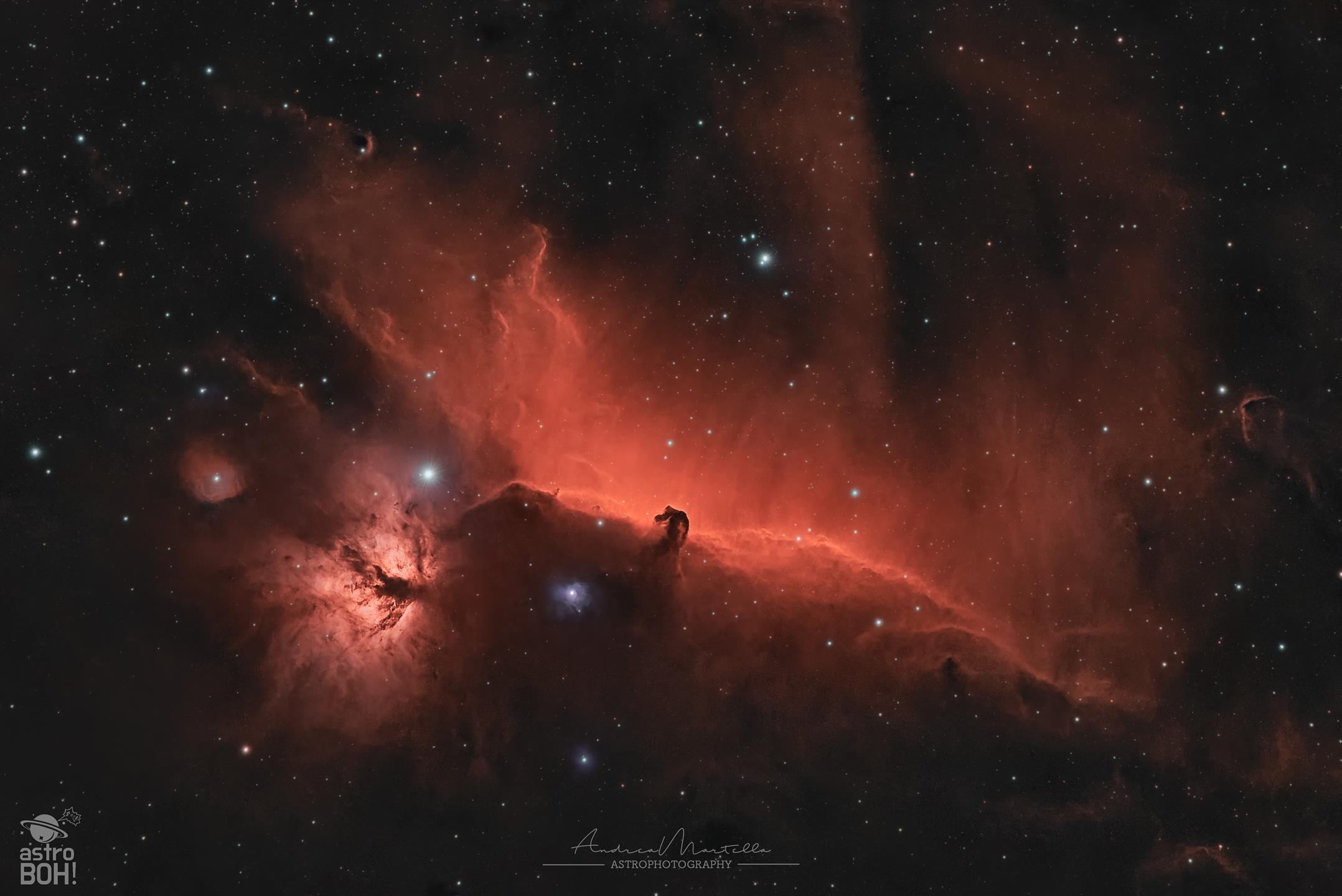 Sul fondo dell’immagine è visibile una porzione del vasto Anello di Barnard, una gigantesca struttura a emissione di idrogeno ionizzato che abbraccia gran parte della costellazione di Orione. Questo arco di gas è il risultato dell’attività energetica di stelle massicce e di antiche esplosioni di supernova, e fornisce il contesto su grande scala in cui sono immerse le nebulose a riflessione della regione.