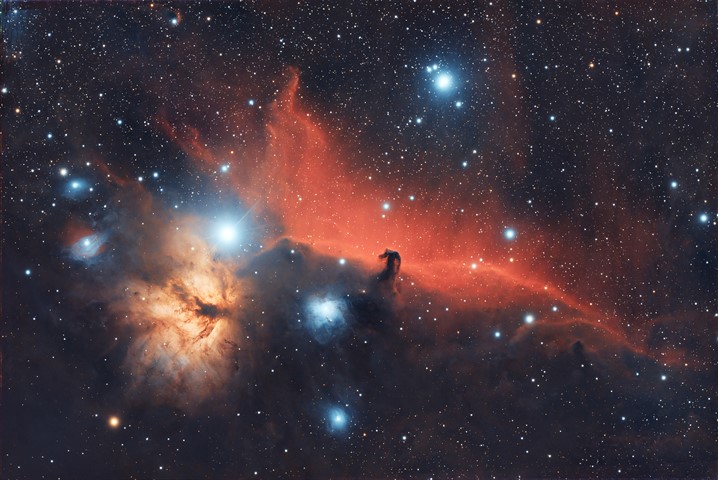 Sul fondo dell’immagine è visibile una porzione del vasto Anello di Barnard, una gigantesca struttura a emissione di idrogeno ionizzato che abbraccia gran parte della costellazione di Orione. Questo arco di gas è il risultato dell’attività energetica di stelle massicce e di antiche esplosioni di supernova, e fornisce il contesto su grande scala in cui sono immerse le nebulose a riflessione della regione.