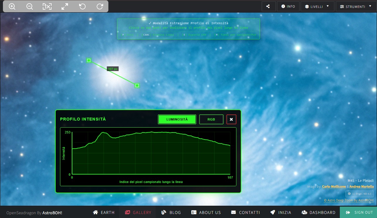 Luminosità (Scala Dinamica): Il grafico si adatta automaticamente al valore massimo rilevato lungo la linea. Questa espansione visiva permette di evidenziare e analizzare le minime variazioni di micro-contrasto e i dettagli strutturali anche nelle zone più buie del cielo stellato o all'interno di nebulose deboli, dove i valori di luminosità sono bassissimi.